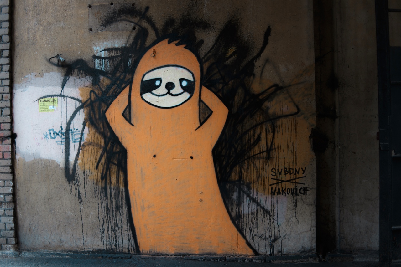 Автор мема «Свободный от забот» нарисовал новое граффити с ленивцем под аркой в Петроградском районе. Предыдущие рисунки на «Приморской» закрасили