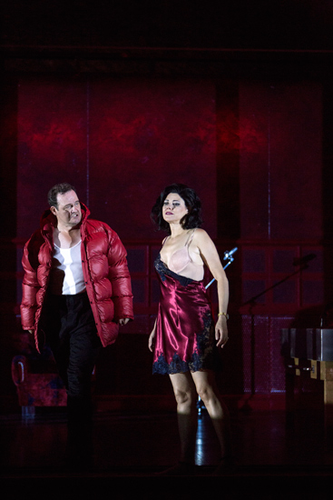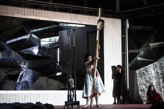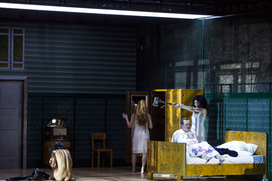 © Salzburger Festspiele / Bernd Uhlig Варликовский вдохновлялся фильмом Пазолини «Сало, или 120 дней Содома», садомазо присутствует, но в какой-то начальной форме, не помогает даже видео, в целом дело ограничилось красивым и сильным телом обнаженной танцовщицы (Розальба Герреро Торрес заслуживает отдельного упоминания). По причине культа мертвой матери Диониса Семелы весь спектакль на авансцене стоит стеклянный гроб с ее телом. Финальные события рождают образ девушки с топором в руках. Эстетически неприятно, физиологически нейтрально, по-человечески же все понятно: мстительный юноша не любит родственников, юный царь силен в просветительских идеалах, но не в политической тактике, любящий его дед (Кадма поет сэр Уиллард Уайт) разрывается между любовью к внуку, которому сам же передал власть досрочно, и желанием жить как все, по законам предков. Ну и вакхические сцены — они даны без излишеств, почти по-домашнему, скорее обозначая, чем показывая.