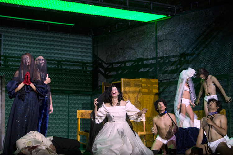 Из-за огромных размеров сцены Нагано потребовался второй дирижер — хоровой. Участники спектакля обычно распределены по отсекам: справа — пространство царя, в центре — его официальные покои, слева — хор и место культа. Художник Малгожата Щесняк насытила античный мир множеством современных деталей (дизайн явно послевоенного времени), глаза разбегаются, но в пространстве Фельзенрайтшуле взгляду не привыкать теряться. Пестрота похожа на жизнь в безразмерной империи — вроде всего происходит много, но как-то успеваешь и охватить, и прочувствовать, и понять, что на самом деле не происходит ничего. Все предопределено — и не только между кузенами, разве что вид смерти каждому предназначен свой.