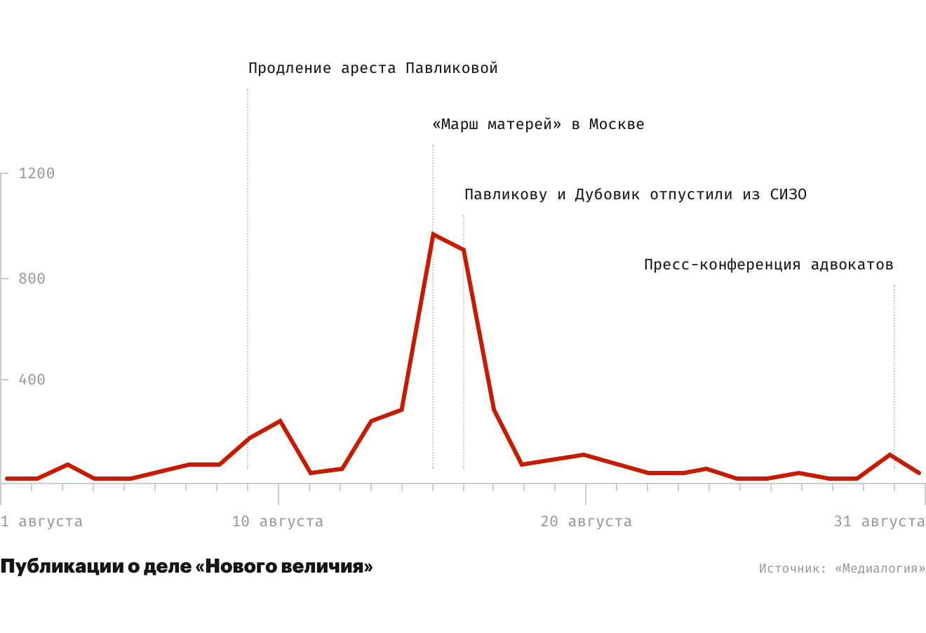 Как только Павликову и Дубовик перевели под домашний арест, интерес в соцсетях к делу «Нового величия» практически полностью пропал. Публикаций в СМИ также стало значительно меньше, хотя во второй половине августа было сразу несколько знаковых событий: 18 августа обвиняемый по делу Дмитрий Полетаев написал письмо из СИЗО с просьбой о помощи, а три дня спустя с журналистами впервые пообщался Руслан Д. — человек, который, судя по материалам дела, мог быть провокатором спецслужб.