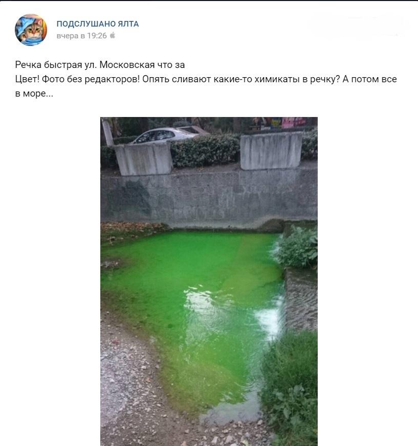 О том, что в Дерекойке появилось зеленое вещество, писали и многие ялтинцы, выкладывая фото в соцсетях, в частности, «Вконтакте». Судя по датам, зелень в реке как минимум всю последнюю неделю лета.