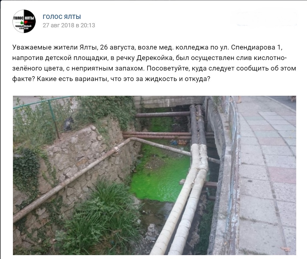 В группе «Голос Ялты» о сливе неизвестного вещества в Дерекойку сообщили 27 августа. Ее видели у медицинского колледжа и напротив детской площадки по улице Спендиарова, «Был осуществлен слив кислотно-зеленого цвета, с неприятным запахом. Какие есть варианты, что это за жидкость и откуда?» – спрашивают авторы сообщения.