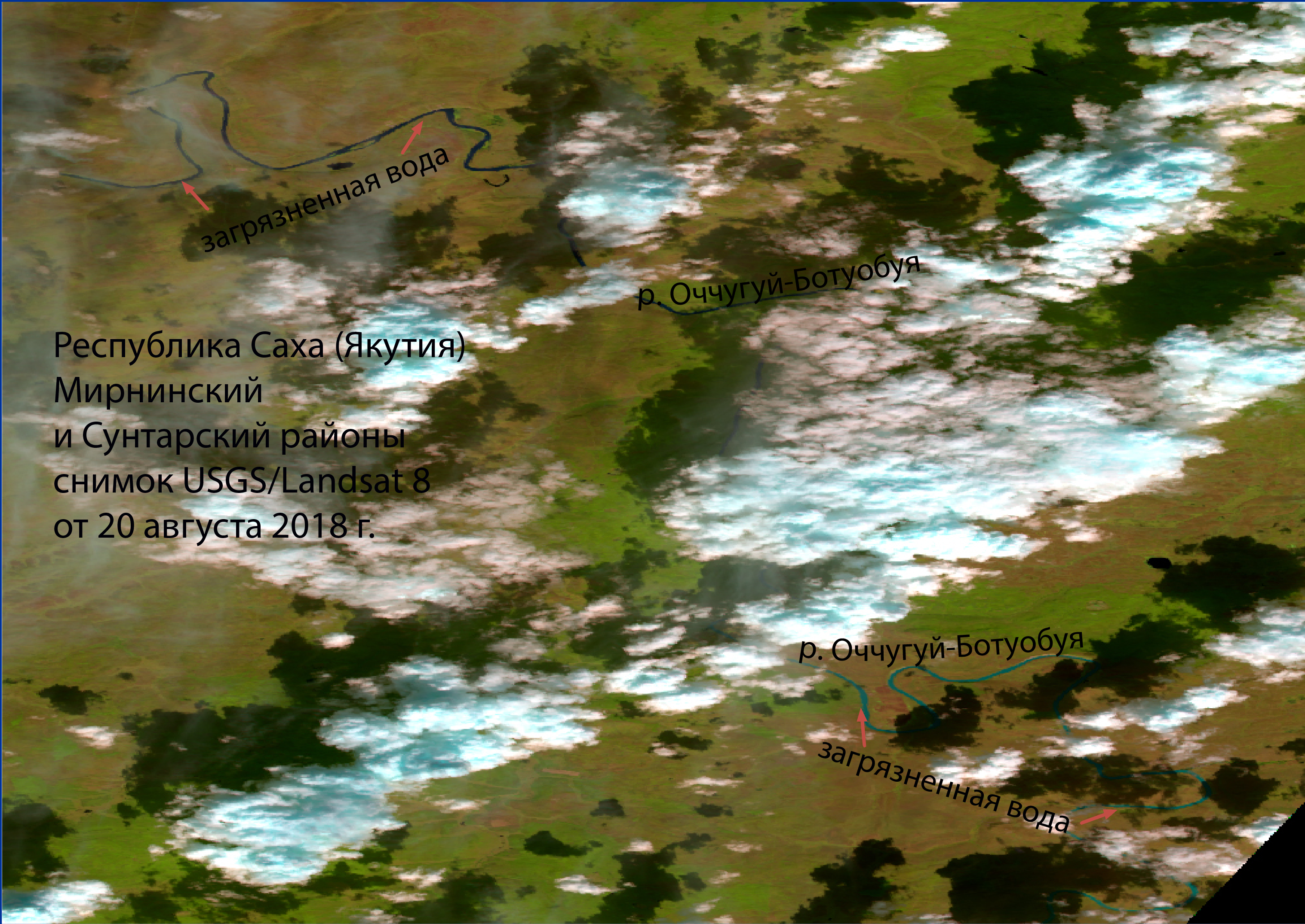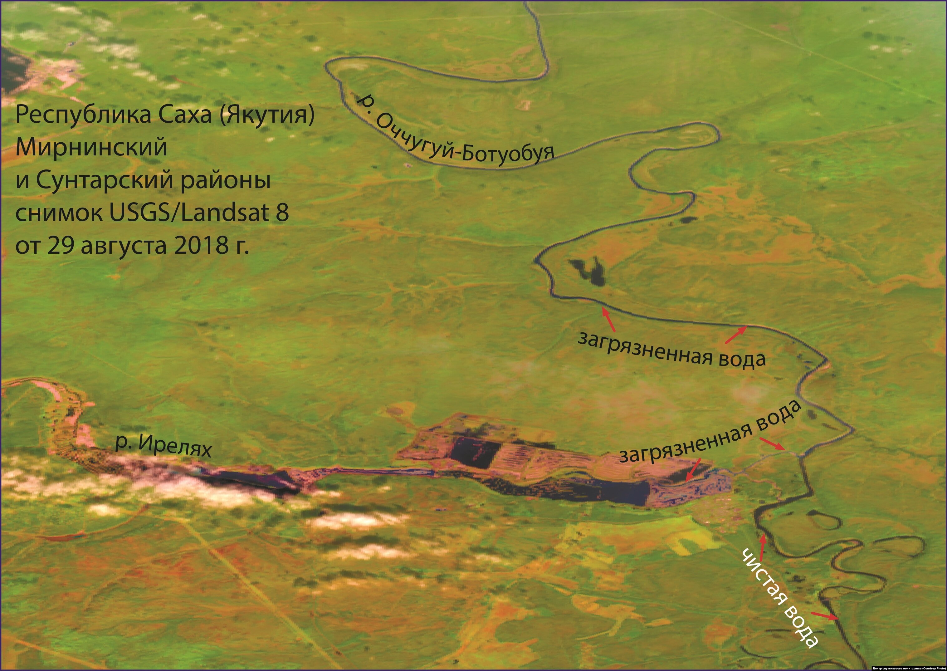 По словам руководителя Центра спутникового мониторинга Ольги Чупаченко, при сравнении снимков от 20 августа и 22 августа видно, насколько увеличилось загрязнение реки Вилюй. На снимке 29 августа заметно, что интенсивность загрязнения постепенно снижается, но утечка мутной воды из реки Оччугуй-Ботуобуя продолжается и прослеживается до Вилюя на протяжении 100 километров. 2 сентября снимок из космоса захватил участок реки Вилюй между городами Нюрба и Верхневилюйском. Не нем видно, что воды Вилюя все еще сильно загрязнены.