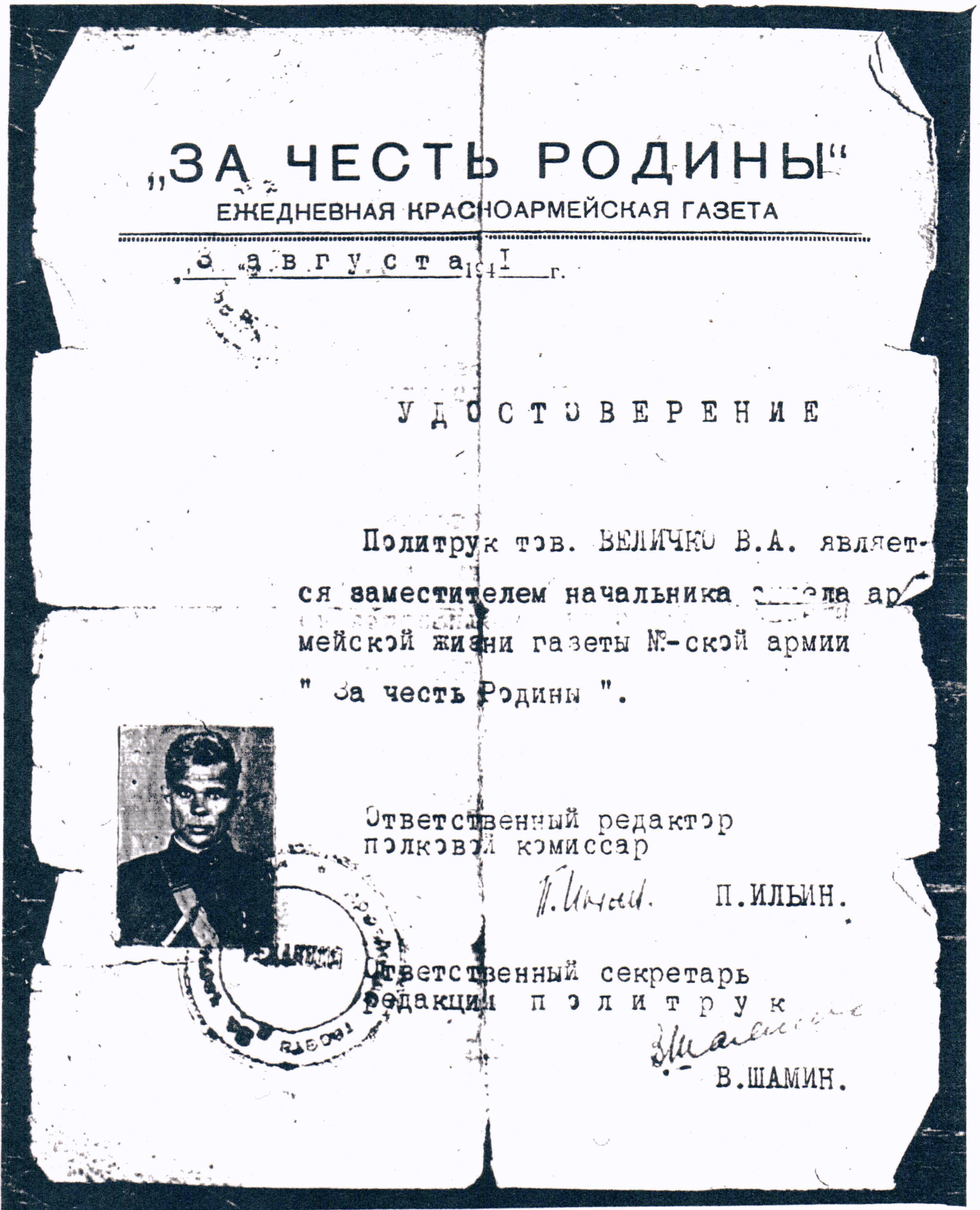 Уже 22 июня 1941 г. в составе 24-й армии Величко отправился из Новосибирска на фронт в качестве литератора. "Но первое время мне пришлось заниматься не писательством, а командовать стрелковой ротой в тяжелейших условиях отступления", – напишет он позже.