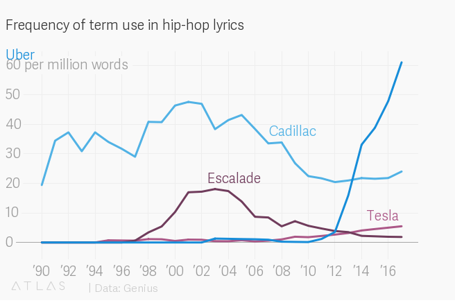 С 2010-х годов американские рэп-артисты, в том числе самые известные, стали гораздо реже упоминать в своих текстах автопроизводителя Cadillac и его Escalade — одни из главных символов успеха и достатка в США. На смену им пришли Tesla и, как ни странно, Uber: рэперы часто читают о своей (или чужой) luxury-жизни, и упоминание сервиса такси не выглядит логичным. Впрочем, объясняет Mashable, такие исполнители предпочитают быть в культурном авангарде и всегда отдают должное модным трендам. «Это часть американской жизни прямо сейчас. Настолько же большая, как Twitter и Instagram», — рассказывал один из исполнителей.