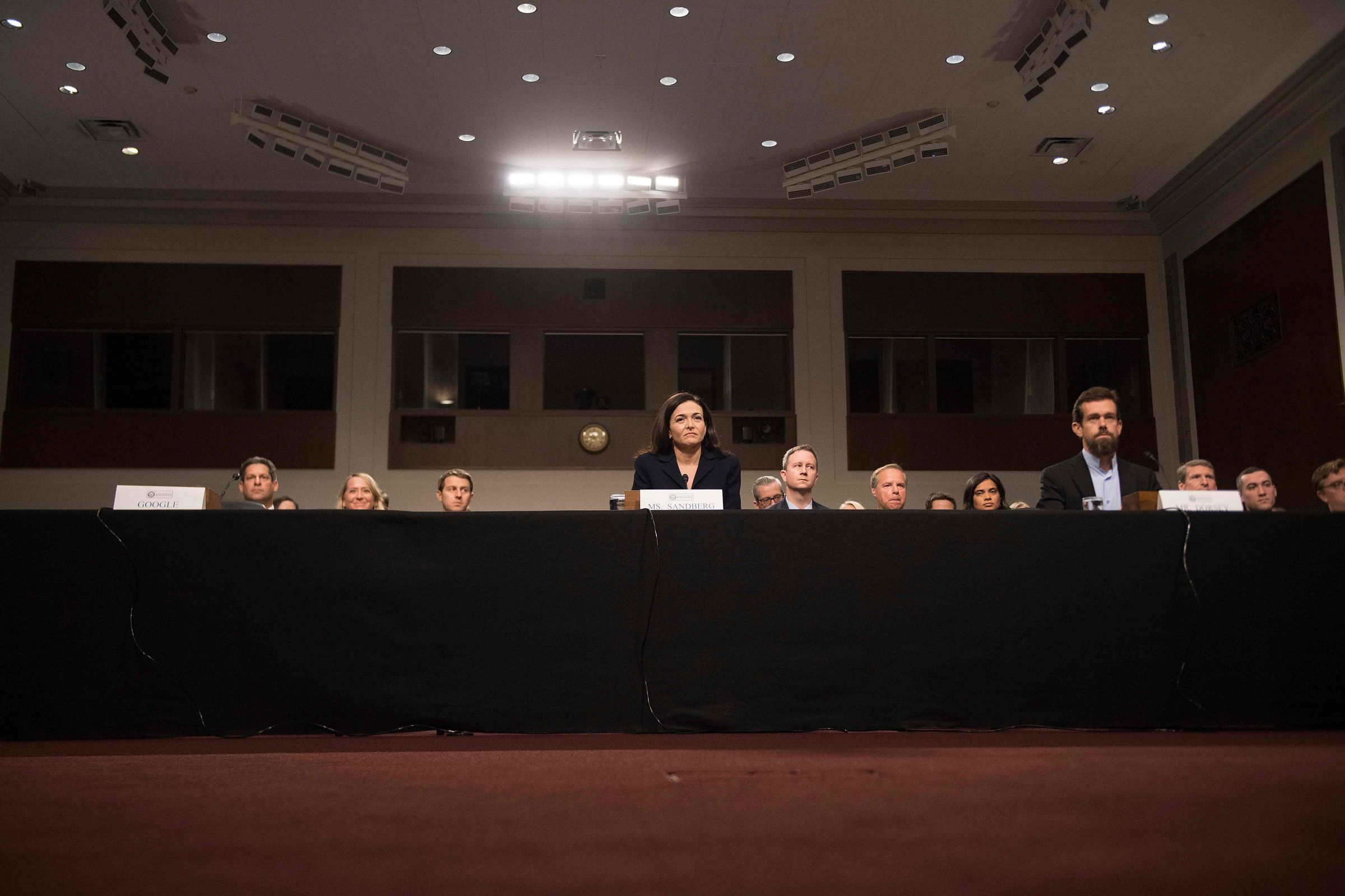На столе, за которым сидели топ-менеджеры Facebook и Twitter, осталась табличка для представителя Google. Некоторые сенаторы выступили с критикой корпорации за отказ участвовать в слушаниях: они говорили, что «расстроены» и «оскорблены» решением Google, а также желали доброго утра «невидимому свидетелю».