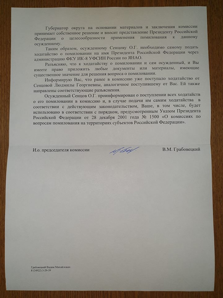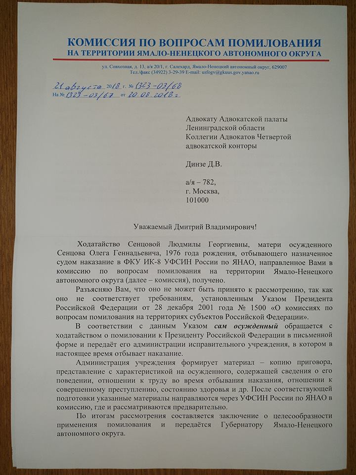 В ответе, который опубликовал адвокат Дмитрий Динзе, говорится, что обратиться с ходатайством о помиловании к президенту должен «сам осужденный».