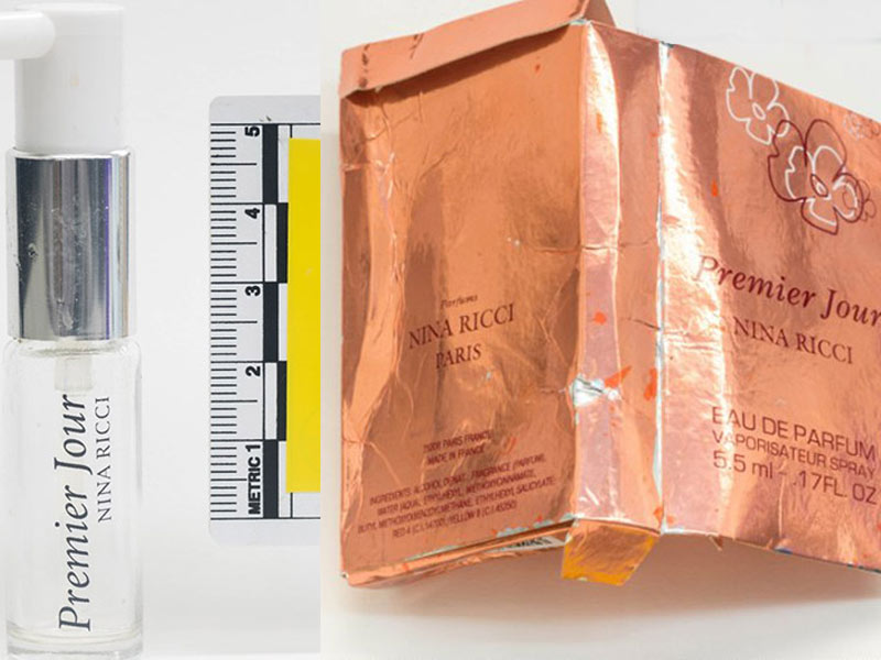 Также полиция опубликовала фотографию флакона из-под духов Nina Ricci, в котором, как считают следователи, был провезен и хранился «Новичок». Полицейские считают, что нападавшие выкинули флакон после того, как обработали с его помощью отравляющим веществом дверь дома Скрипаля, однако сделали это небрежно. Флакон нашли Дон Стерджес и Чарли Роули, которые также получили в конце июня отравления, Стерджес 8 июля скончалась.