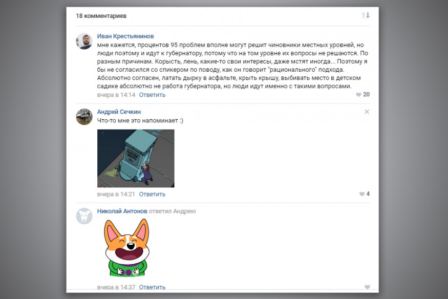 Один из подписчиков даже предложил «яму вырыть метров на сто глубиной, над нею помост с раздвижным дном возвести, и пусть каждый год губер там речь толкает, а жители голосуют. Прогнал туфту, народ не схавал ее и поставил «неуд», значит, дно раскрывается, и ждем следующего губера».