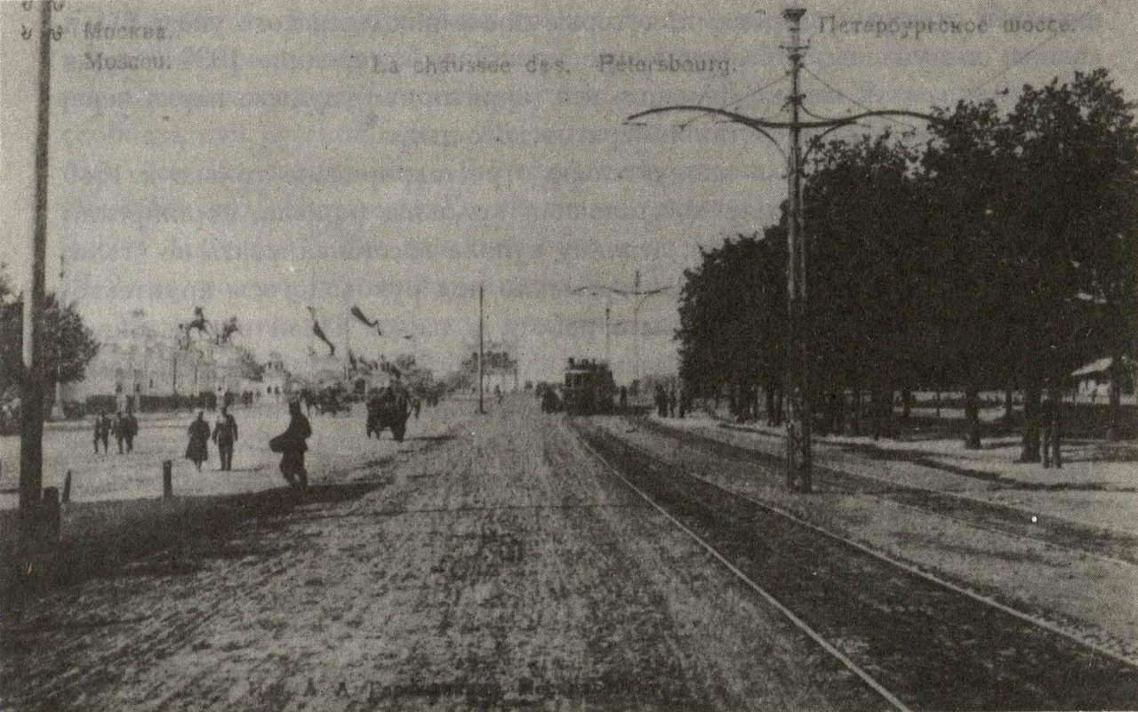 Трамвайная линия на Петербургском шоссе, 1911 г.Фото: из коллекции В.О.Седельникова Уже ночь, тихая и ласковая. Взвод красноармейцев ждет нас. «К стенке». Целуемся. Идем. Темнеет высокая стена.