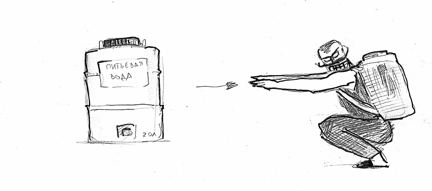 Во-вторых, бачок для питьевой воды (для которого был сшит специальный рюкзачок из банного полотенца).