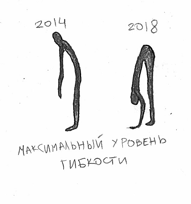 8 минут с утра и 20 минут вечером я занимался увеличением своей гибкости. Как вы могли догадаться, для этих целей я заказал самоучитель. В начале занятий гибкостью я превосходил только граненый стакан, но существенно уступал опоре моста. При наклоне вперед из положения стоя пальцами я мог достать уровня колен. Когда освобождался, то уже с легкостью мог «дать пять» напольному покрытию.