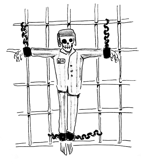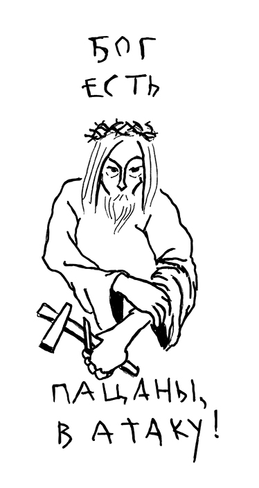 Периодически я рисовал на стенах — но это было грустно. В основном потому, что наутро рисунки закрашивали. Зато так я мог делать локально-косметический ремонт стен. Однажды у нас даже случилось состязание с Боцманом. На входе в камеру висел листик с наглядной картинкой формы установленного образца в зимний и летний периоды. Под листиком я нарисовал карандашом милого поросенка в маске ОМОНа. Однажды Боцман обнаружил рисунок под листиком и велел инспекторам стереть его. Я нарисовал нового, но уже графитовой акварелью — ластиком такого не сотрешь. А если попытаешься водой (а они, естественно, попытались), получается только хуже. Решили закрасить. Пару дней я смотрел на маленький бежевый квадратик на бежевой стене. Цвет тот же, оттенок другой. Как такое можно терпеть? Я нарисовал в квадратике сжатый кулак — символ сопротивления. Опять закрасили, квадратик стал больше, и мой ответный рисунок тоже вырос в размерах. И так далее. Очень скоро рисунки занимали по полстены, а зэк, работающий в стройбригаде и приходящий каждое утро закрашивать у меня стены, интересовался, что я буду рисовать завтра. Как оказалось, он проникся художественным смыслом нашей дуэли. Дуэль продолжалась вплоть до моего перевода в общий барак и дальше в БУР.
