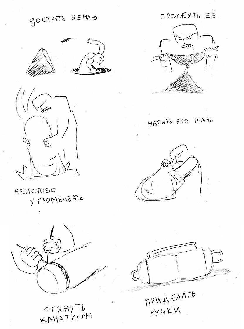 Кроме того, у нас была гантелька — ее неоднократно изготавливал Толя Могила (о нем позже). Делалась она так: в тюремном дворике (или в камере, если поднять пол) извлекался плодородный слой земли. Слой этот содержал кирпичи, камни и прочие ненужные артефакты, так что его нужно было просеять через сетчатую мочалку. Просеянной землей забивалась форма из предварительно перешитой в мешок простыни, потом она затягивалась канатиками, еще раз оборачивалась тканью из простыни и прошивалась — для тугости и чтобы плодородный слой не высыпался. К получившейся спортколбаске добавлялись ручки, и вуаля — гантелька-утяжелитель была готова служить целям ЗОЖ.