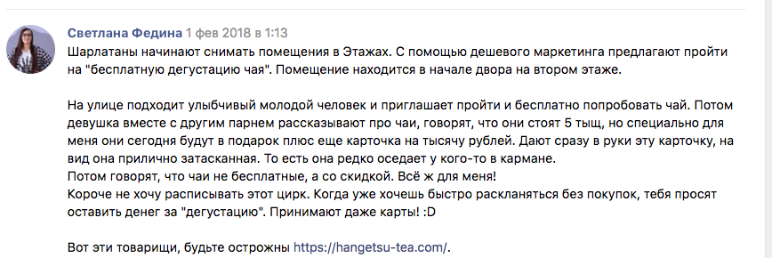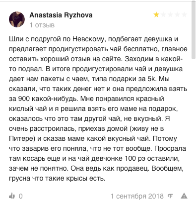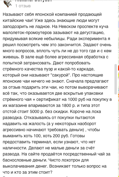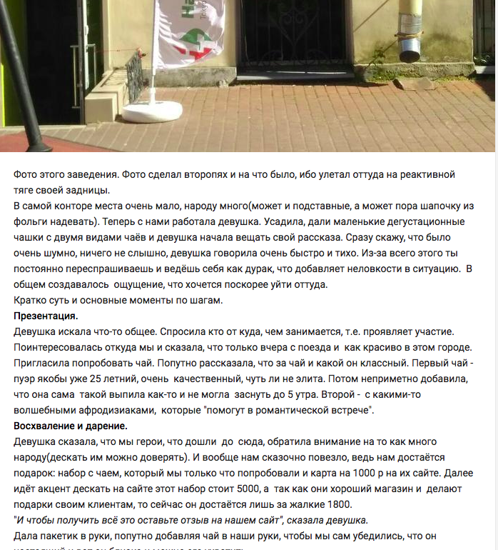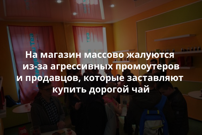 Как рассказывают читатели «Бумаги», промоутеры упрашивают прохожих «бесплатно» попробовать чай. На самой дегустации, по словам посетителей, рекомендуют попробовать «25-летний пуэр». После продавцы предлагают приобрести набор чая за 1800 рублей, если посетитель оставит отзыв на сайте. По словам продавцов, без скидки набор стоит 5000 рублей. Посетители рассказывают, что после отказа купить чай их просили оставить чаевые — 100 или 200 рублей. В некоторых случаях, согласно отзывам, отказавшимся платить грубо хамили.