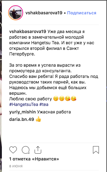 Бывшая сотрудница Hangetsu Tea анонимно рассказала «Бумаге», что примерный возраст промоутеров — от 15 до 23 лет, продавцов — от 17 до 24 лет. По ее словам, она устроилась в магазин промоутером в 18 лет и проработала там примерно полмесяца. Она также рассказала, что руководителя магазина она видела трижды — ей представили его как Даниила.