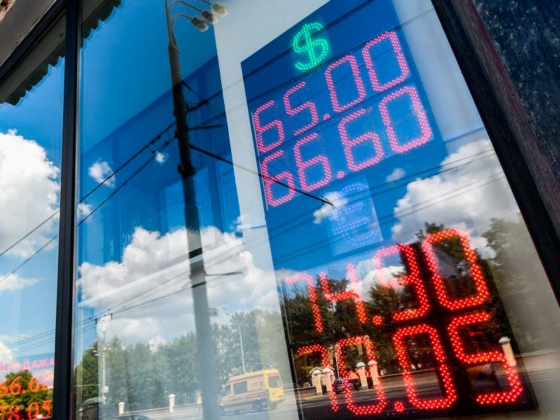 Табло курса обмена валюты. Август 2018 / АГН "Москва" / фото: Иванко Игорь В целом проект бюджета исходит из сохранения макроэкономической стабильности. Минэкономики предсказывает даже стабильность курса рубля на уровне 64 рублей за доллар в ближайшие три года и падение курса до 67 рублей за доллар к 2025 году. При этом ожидается, что инфляция все-таки станет выше целевого значения ЦБ, достигнув пика в 5% в январе 2019, но затем опять начнет снижаться и уже в 2020-2021 гг. будет держаться в районе 4%.