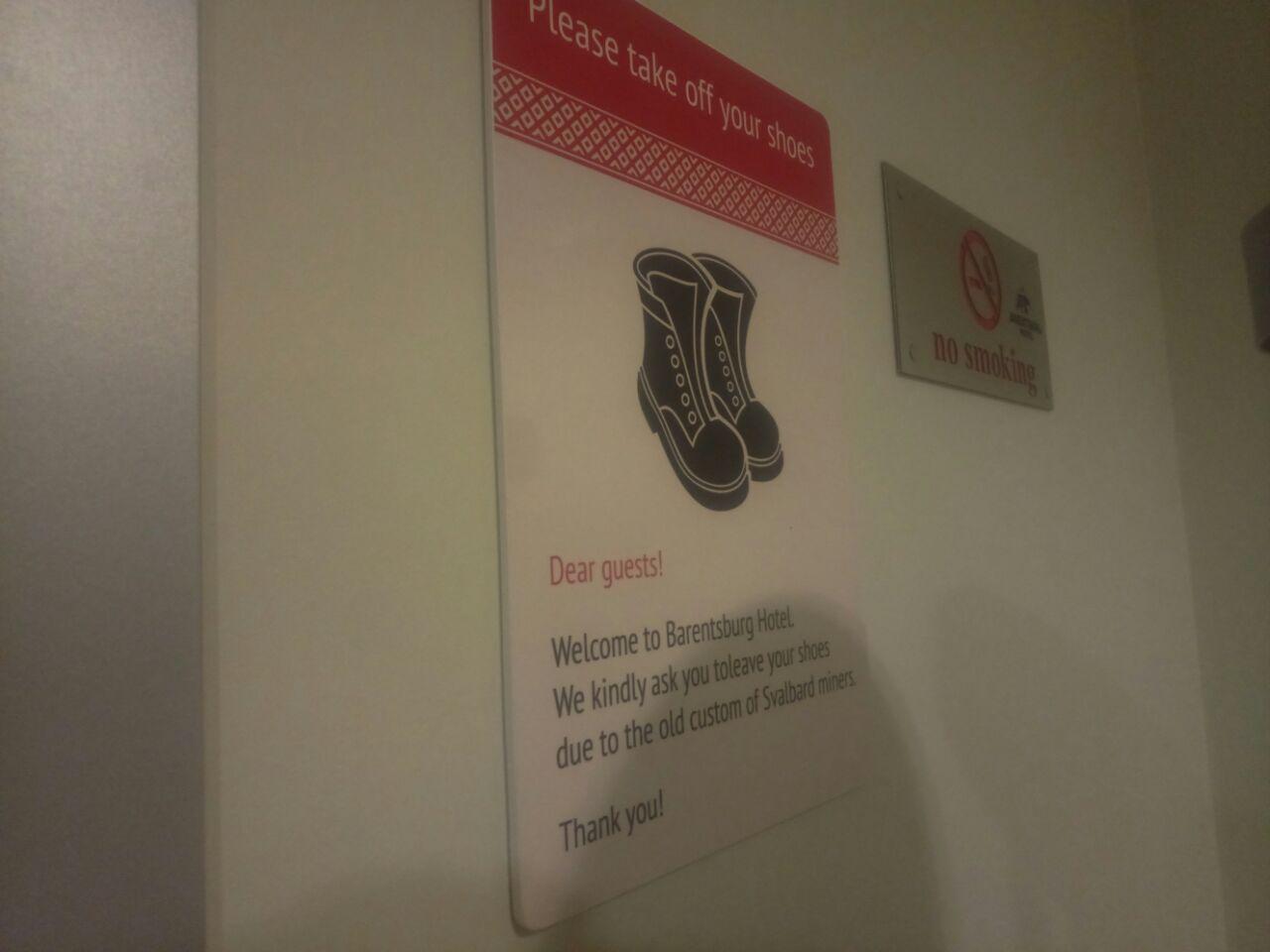 Старая традиция Шпицбергена — снимать обувь при входе. И речь не только о посещений гостей. В гостиницах Лонгйира (норвежский город Шпицбергена, ну или по-местному, Свальбарда) и Баренцбурга (российский город на Шпицбергене) есть специальные полочки для обуви, куда вы можете поставить свою уличную обувку, а взамен надеть тапочки. В ресторанах, офисах тоже нужно разуться. Такой обычай связан с тем, что шахтеры всегда приходили в грязной обуви с работы, вот и заставляли их всегда и везде снимать ботинки. Уж не знаю, насколько чистой была их одежда, но обычая раздеваться на Шпицбергене не появилось. К счастью. Уж очень там нежарко.