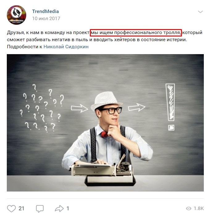 Московский штаб Навального выяснил, что координацией этих интернет-троллей занимается экс-активист прокремлевского молодежного движения «Наши» Николай Сидоркин. Совместно с другими известными нашистами – Артёмом Шургальским, Алексеем Филоновым и Александром Заборовским - Сидоркин учредил SMM-компанию TrendMedia, которая открыто размещает вакансии троллей.