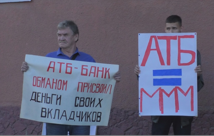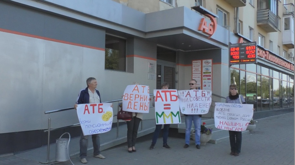 В центре Кемерова между зданиями Центробанка и местным офисом Азиатско-Тихоокеанского банка сегодня прошел пикет. Больше 20 вкладчиков вышли на улицу с плакатами "АТБ, верни деньги обманутым пенсионерам", "АТБ – участник финансовой пирамиды", "АТБ = МММ". Таким образом клиенты банка попытались привлечь внимание общественности и полицейских к своей проблеме. Люди заявляют, что именно сотрудники финансовой организации навязали им векселя "Финансовой торговой компании", а в мае этого года АТБ полностью прекратил по ним все выплаты и сложил с себя всю ответственность за их приостановку.