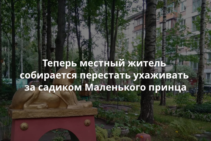Садик Маленького принца находится на Гражданском проспекте между корпусами дома № 31. В посте пишут, что пенсионер просил помочь администрацию и местных жителей с водой для полива цветов, но на его просьбы никто не отвечал. Мужчина носил воду из озера, но оно высохло, и теперь он, говорится в посте, «собирается отказываться от этого мини-парка».