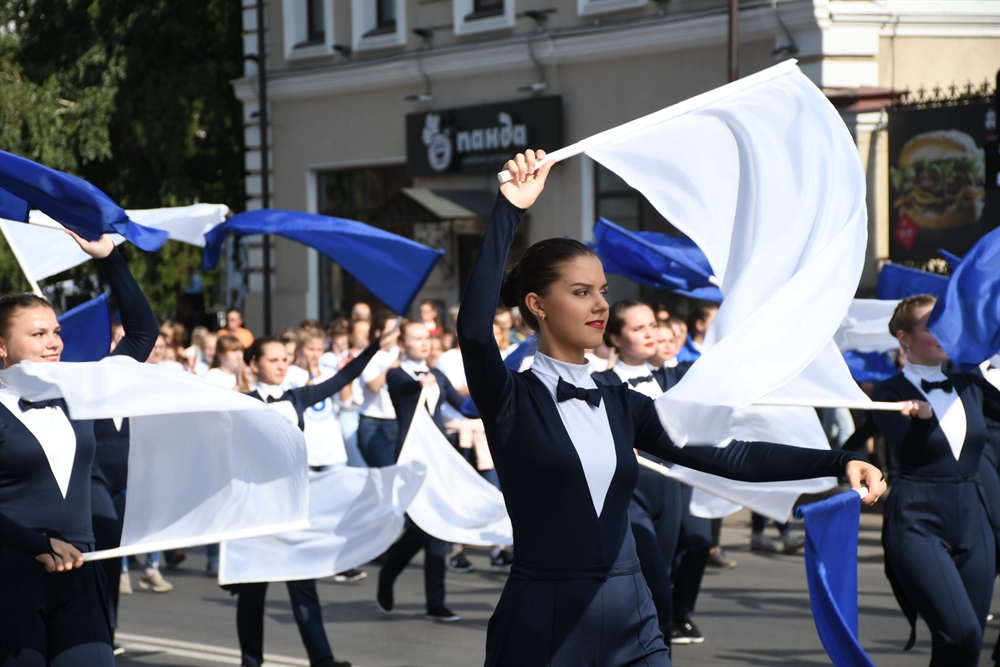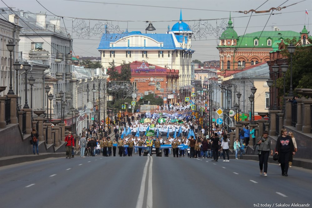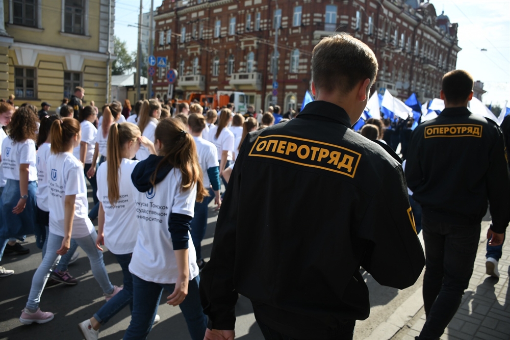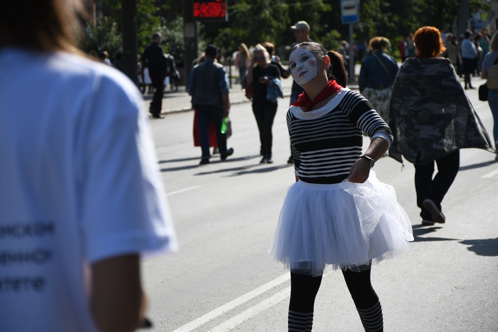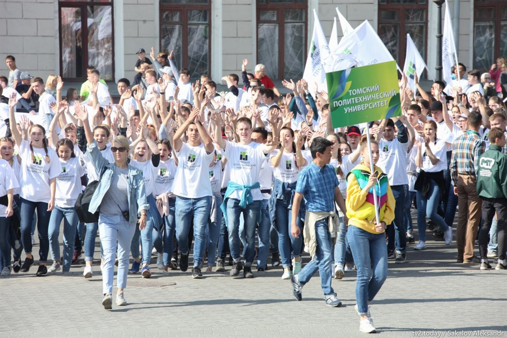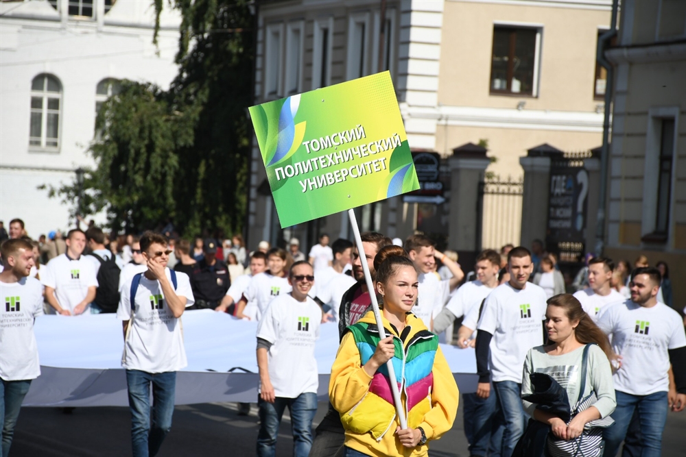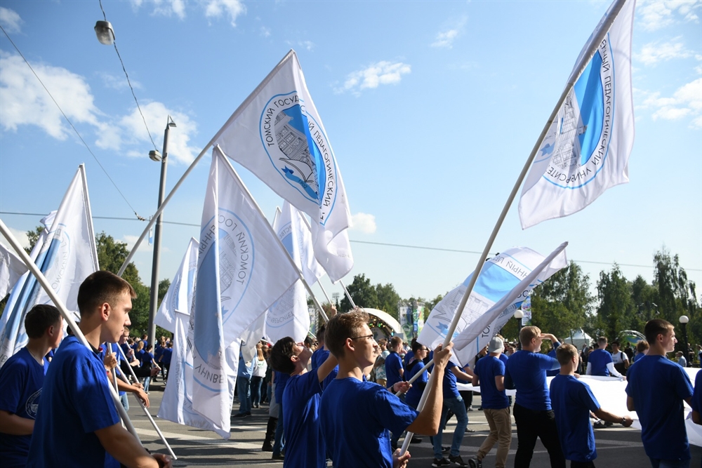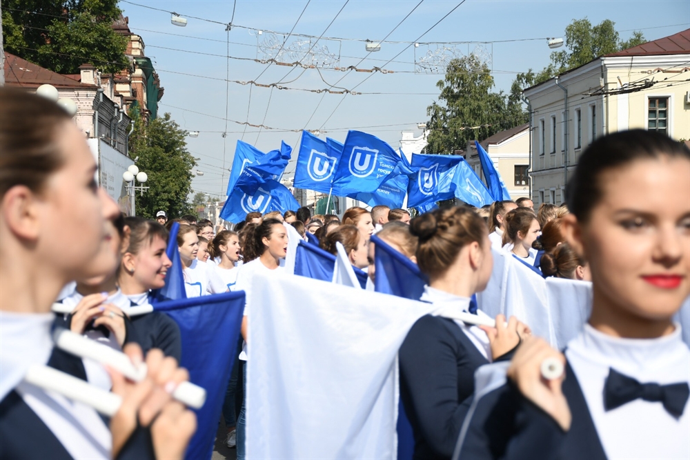 В 12:20 с набережной Томи стартовал торжественный парад университетов. Студенты ТГУ, ТПУ, ТУСУРа, ТГАСУ, СибГМУ и ТГПУ прошли от площади Ленина до площади Ново-Соборной.