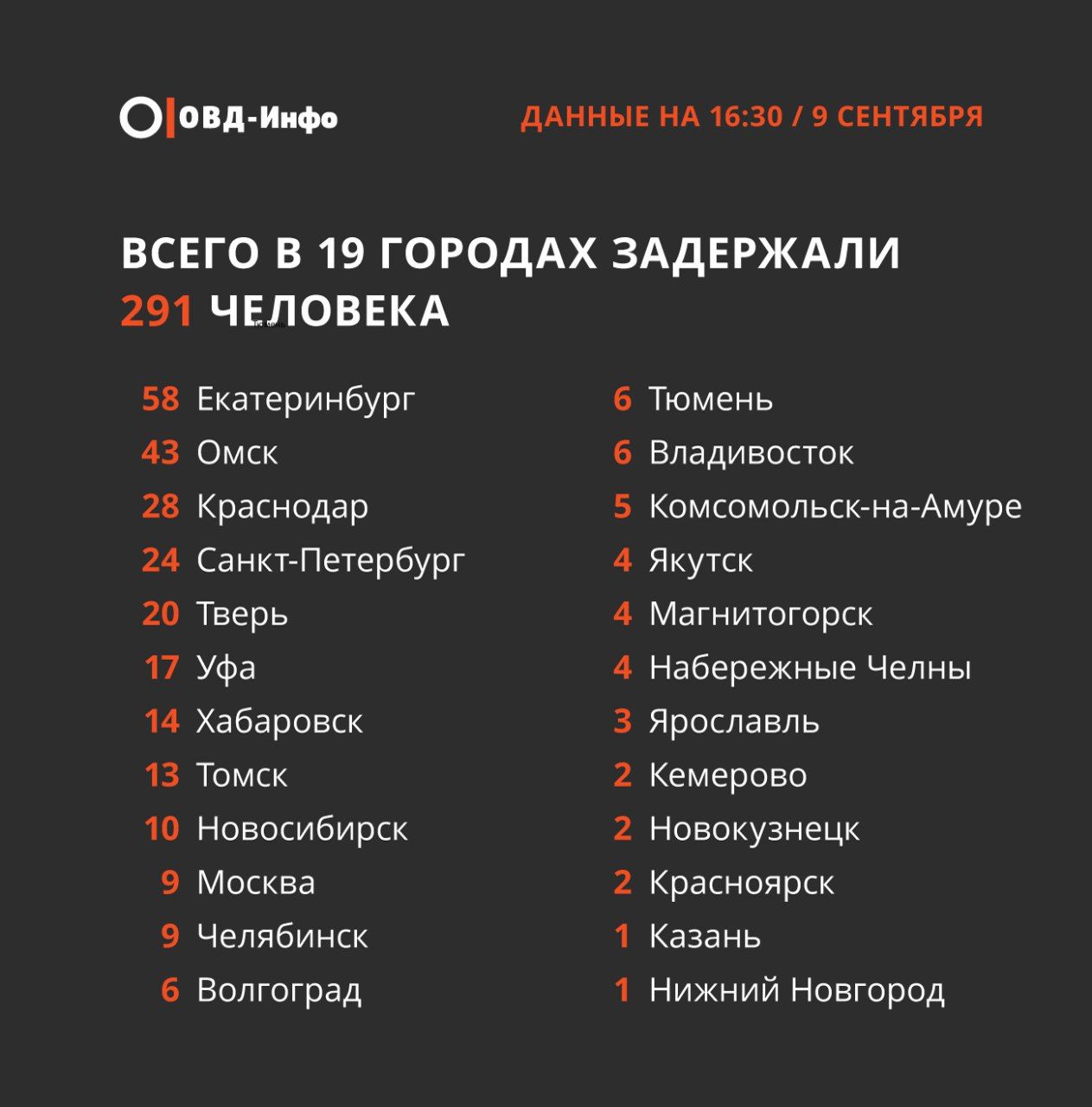 По данным «ОВД-Инфо» на 16:30 мск (на сайте у «ОВД-Инфо» указано время 16:35) по все России в связи с акциями протеста был задержан 291 человек. По этим данным, лидер по задержаниям — Екатеринбург (58 человек).