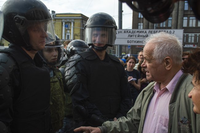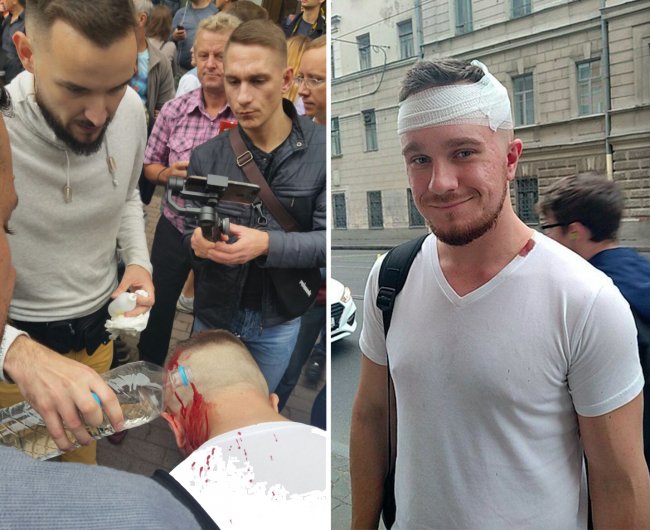 У Финляндского вокзала полиция задержала около 50 человек. В основном брали тех, кто держал плакаты, шарики или громко кричал. Разогнать людей пытались даже дымовой шашкой, которую задействовали почти сразу, с началом акции. Спустя примерно полтора часа стояния колонна людей двинулась в Финский переулок, где появился первый пострадавший. Там демонстранту Владимиру Осипову разбили голову, по его словам, полицейской дубинкой. Врачи диагностировали ушибленную рану теменной области. Юрист Александр Передрук, который будет защищать интересы Осипова, рассказал «Новой», что в понедельник будет подано заявление о совершении преступления. «Это превышение должностных полномочий, – сказал Передрук. – Очевидно, не было необходимости применять силу». Сам юрист в момент разговора с «Новой» находился в 64-м отделе полиции, куда доставили около десяти задержанных и которым грозило провести там ночь.