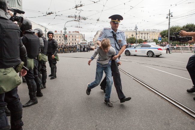У вокзала были и совсем юные участники акции. Моментально по СМИ и соцсетям разлетелась фотография, на которой задерживают мальчика лет 12. На митинге он показывал своим товарищам тетрадку с изображением Владимира Путина на обложке: «Для защиты», – прокомментировал он. Потом, правда, корреспондент наблюдал, как эта тетрадь полетела в ряды ОМОНа, а сам мальчик под аплодисменты толпы забрался на светофор.