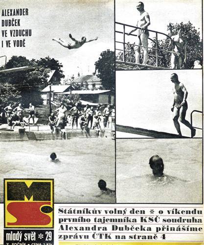 В самом 1968 году возникают образы с политическим содержанием, которые совершенно не основаны на неких утверждениях или политических заявлениях, а чисто визуальные. Например, одним из самых сильных таких образов "Пражской весны", как мне кажется, является генеральный секретарь Коммунистической партии Чехословакии Александр Дубчек в плавках, который на досуге идет купаться, прыгает с вышки, и с ним купается народ. Политбюро – это общественное место, и фотодокументация этого события попадает на обложку журнала "Младый свет", в переводе на русский "Молодой мир", очень популярный журнал того времени. И весь народ видит своего генсека в плавках, который улыбается своей незабываемой улыбкой. Это становится образом, который гораздо мощнее самих заявлений Политбюро.