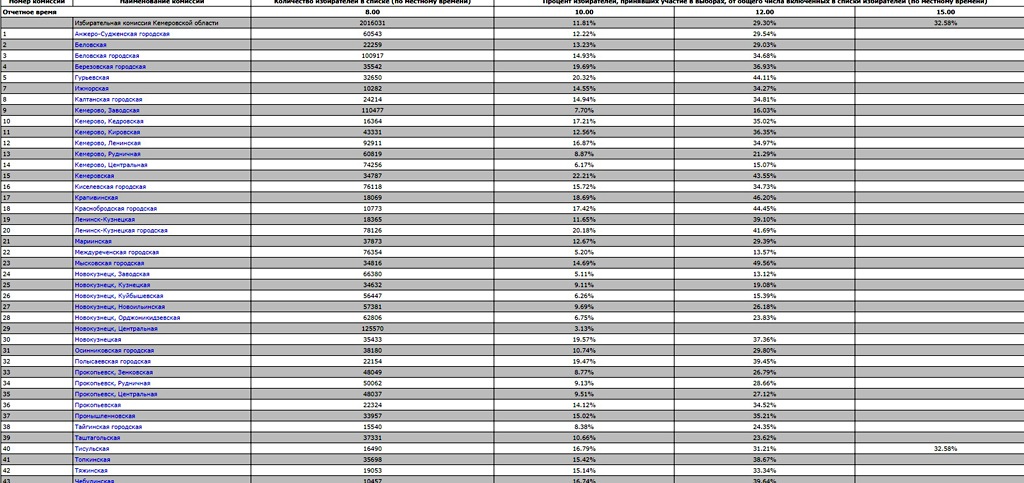 12:49 В Кузбассе каким-то чудом уже известна явка избирателей на выборах губернатора и депутатов облсовета на 15:00 по Тисульской территориальной комиссии - 32,58%. Данные опубликованы на ГАС.Выборах.