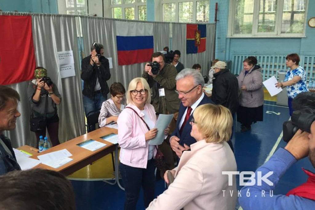 11:05 Александр Усс в Красноярске тоже проголосовал. Любопытно, кстати, в Новосибирске первые лица без галстуков голосуют, а вот Усс галстук надел.