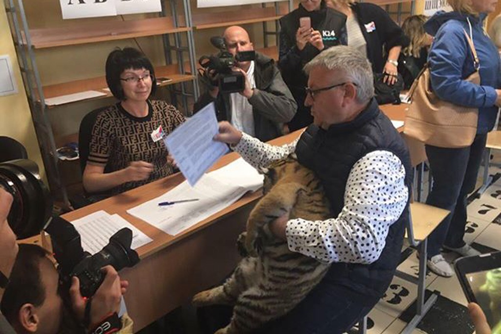 14:09 Барнаул славится приколами на избирательных участках. Но если на прошлых выборах всех заткнули за пояс местные моржи, которые пришли голосовать в плавках, то сегодня пальму первенства уверенно держит директор местного зоопарка, пришедший голосовать с тигренком на руках.