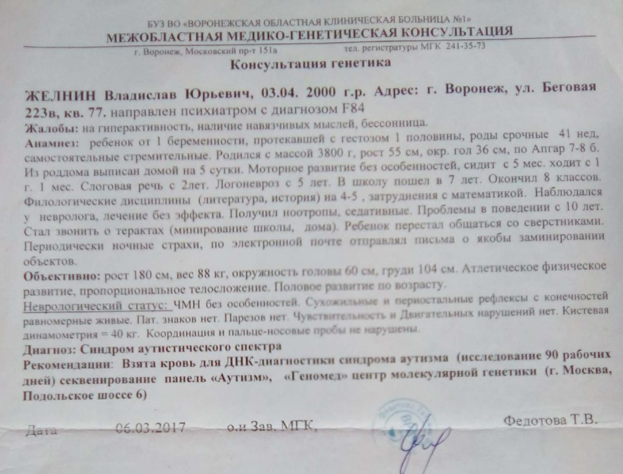 Тогда же Олеся стала возить сына по врачам, чтобы снять диагноз «шизофрения». Были на обследовании в Москве и, наконец, в Воронеже получили справку о «расстройстве аутистического спектра». Ее мать и предъявляет в качестве документа, на основании которого ее сына должны освободить из СИЗО.