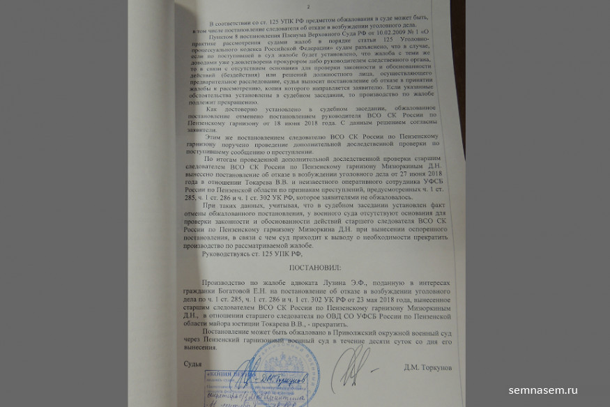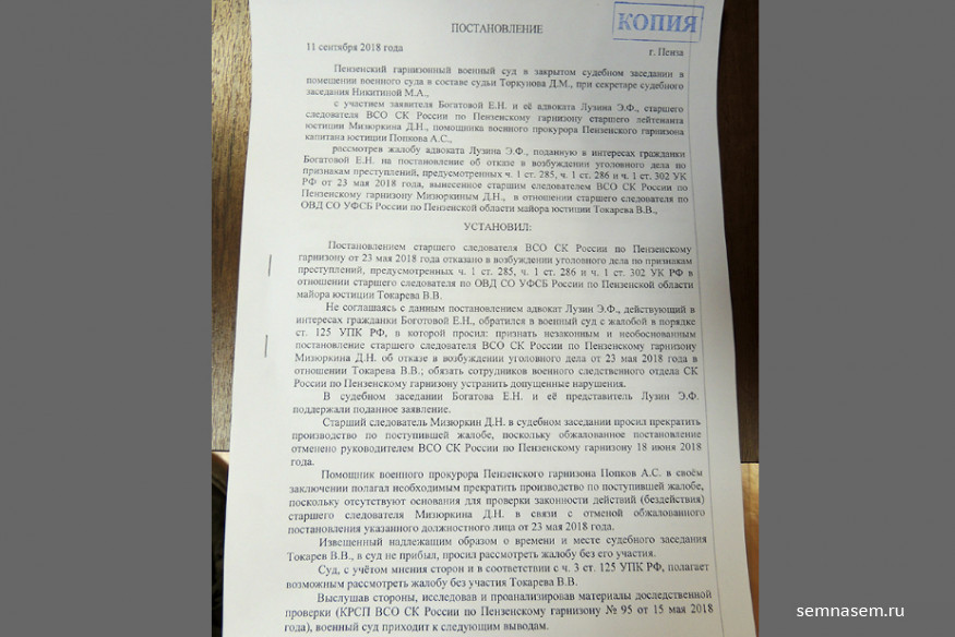 Елена Богатова написала заявление о незаконных действиях следователя управления ФСБ по Пензенской области Валерия Токарева. Проверкой изложенных обстоятельств занимался военно-следственный отдел Следственного комитета по Пензенскому гарнизону. Он вынес постановление об отказе в возбуждении уголовного дела 23 мая 2018 года. 11 сентября Пензенский гарнизонный военный суд рассмотрел жалобу Елены Богатовой на это постановление.