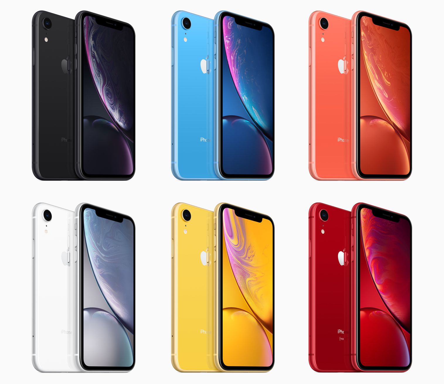 Более дешевая версия: экран LCD вместо OLED (такой же в iPhone 8), боковые рамки из алюминия, а не стали. Зато экран 6,1 дюйма и корпуса разных цветов: белый, черный, красный, желтый, коралловый и синий. Основная камера одинарная, а не двойная, но умеет размывать фон с помощью машинного обучения. Процессор — A12 Bionic.