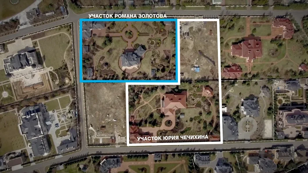 Несколько участков по соседству тоже не чужие для директора Росгвардии. Их суммарная площадь составляет 1,2 га, на них расположен не менее роскошный и большой дом. И вся эта недвижимость принадлежит Юрию Чечихину, зятю Виктора Золотова. Чечихин женат на дочери главнокомандующего войсками национальной гвардии.