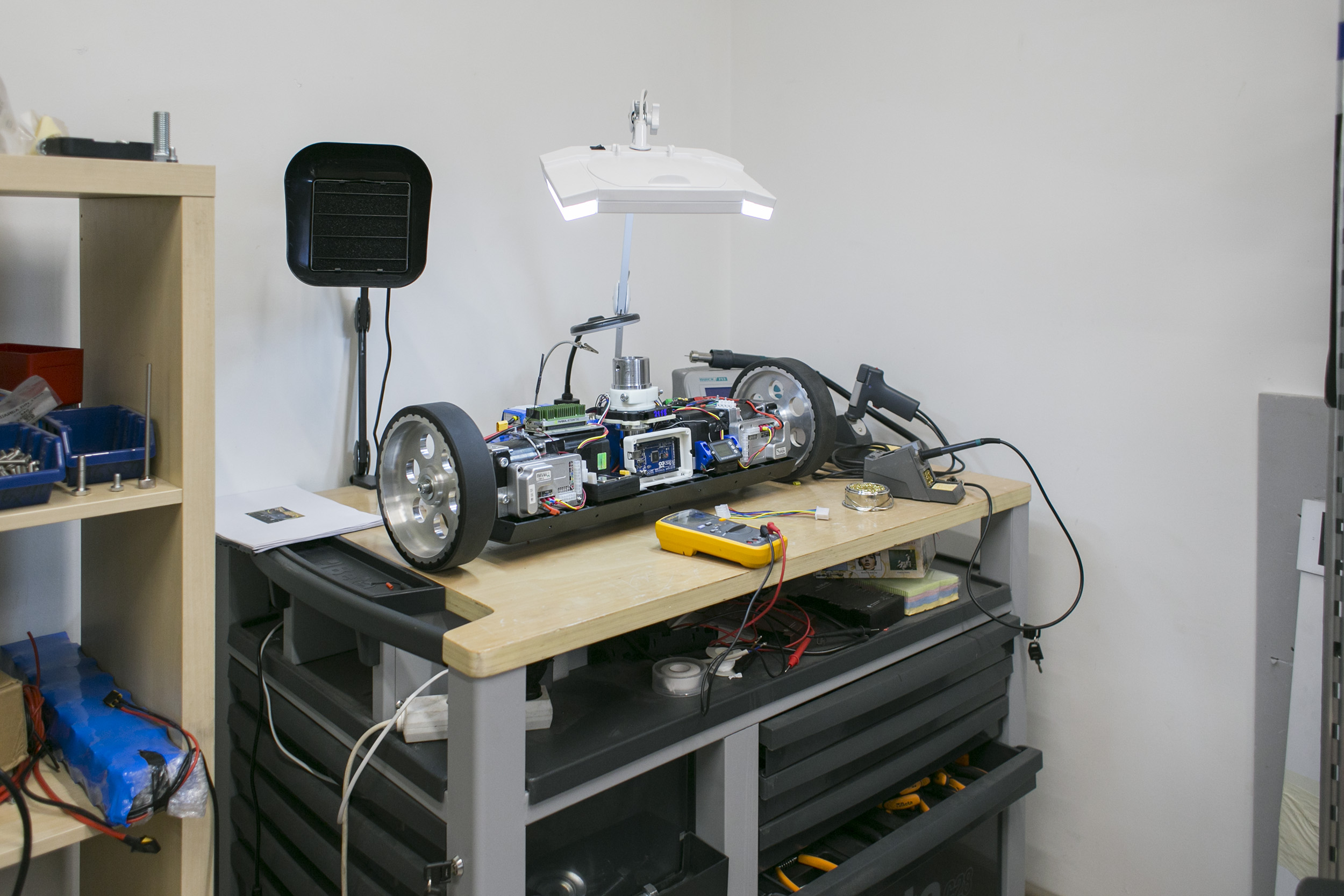 Сейчас мы ведем два значимых проекта. Первый — это мобильная робототехническая платформа с системой управления, двигателями, колесной базой, чтобы осуществлять ориентацию робота в пространстве, локализацию, навигацию. Это базовое устройство: повесили на робота манипулятор — он станет перевозить грузы, поставили тележку — будет возить продукты по магазинам.