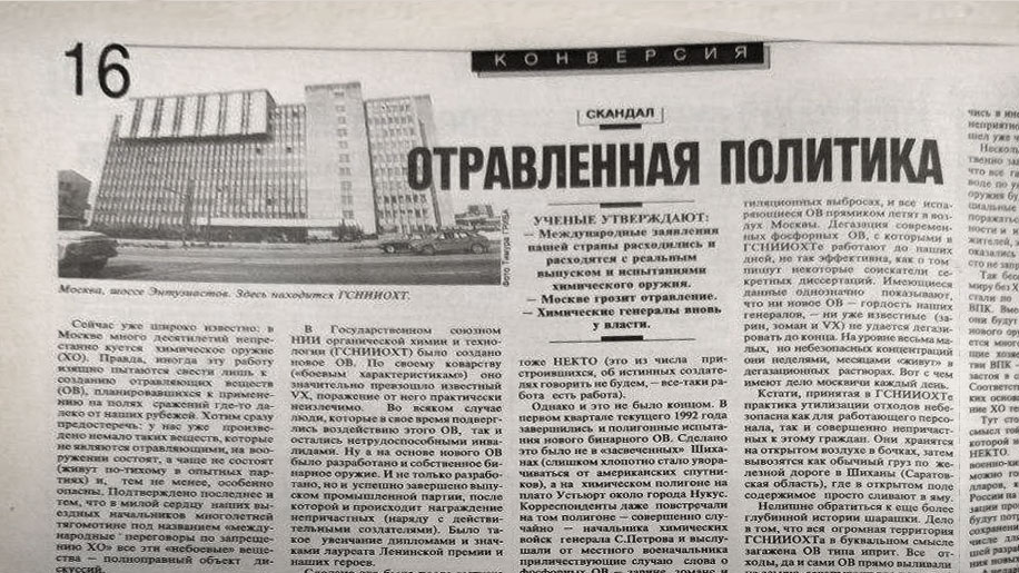 «В Государственном научно-исследовательском институте органической химии и технологии (ГоСНИИОХТ, филиал которого располагается в Шиханах. — «Проект») было создано новое отравляющее вещество. По своему коварству (“боевым характеристикам”) оно значительно превзошло известный VX, поражение от него практически неизлечимо. Во всяком случае люди, которые в своё время подверглись воздействию этого вещества, так и остались нетрудоспособными инвалидами», — писал Мирзаянов в газете «Московские новости» в сентябре 1992 года. Этот текст и стал причиной возбуждения дела.