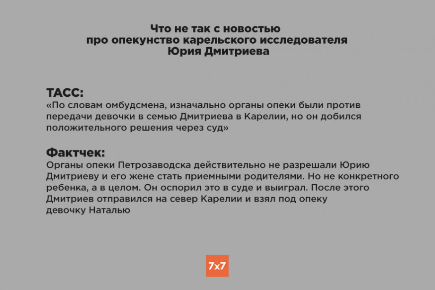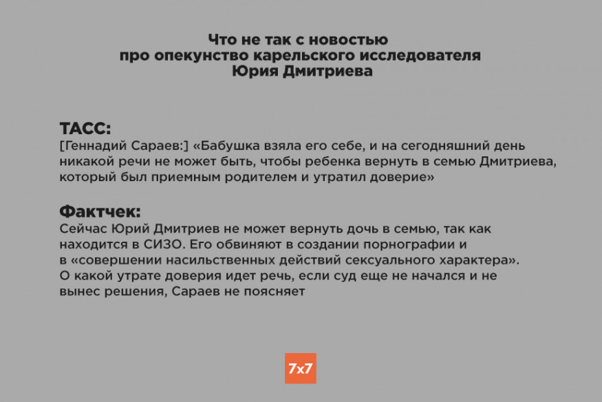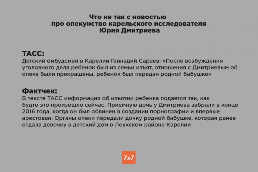Информационно агентство ТАСС 11 сентября опубликовало новость о том, что карельского историка Юрия Дмитриева лишили права опеки над приемной дочерью. Информацию перепечатали многие федеральные СМИ. В тексте ТАСС журналисты ссылаются на детского омбудсмена Карелии Геннадия Сараева, который рассказал о том, что карельский руководитель «Мемориала» после ареста по делу о создании порнографии «утратил доверие» органов опеки. «7x7» объясняет, что не так с этой новостью, в трех карточках.