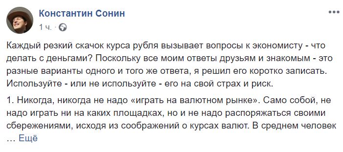 Экономист, профессор Чикагского университета Константин Сонин объясняет, как вести себя в условиях резких скачков рубля, чтобы не потерять деньги. Коротко: не нервничать, не пытаться заработать на валютном рынке, не слушать министров, призывающих покупать рубли.