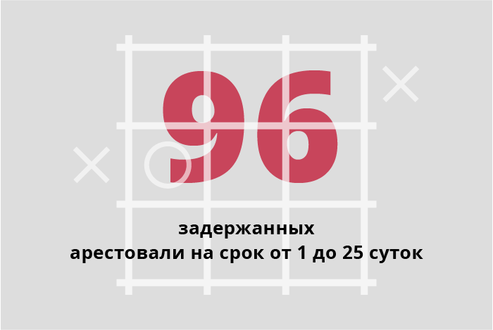 Infogram В первой версии публикации на инфографике приводилась информация о 82 арестованных. Позднее объединенная пресс-служба судов Петербурга опубликовала данные об аресте 96 задержанных.