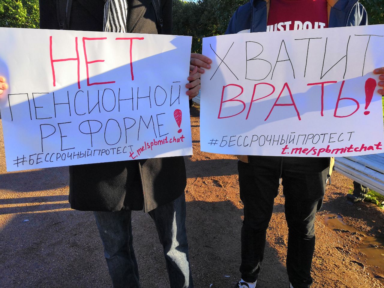 Вечером 13 сентября, как пишет «ОВД-Инфо», одного из участников задержали. Он предлагал автомобилистам посигналить, если те против пенсионной реформы. Позднее задержали еще пятерых. Как пишет «Фонтанка», они держали плакаты «Пенсионная реформа — грабеж» и «За что тебя посадят завтра?». Четверых из них отпустили без составления протоколов, взяв объяснительные, сообщает «ОВД-Инфо».