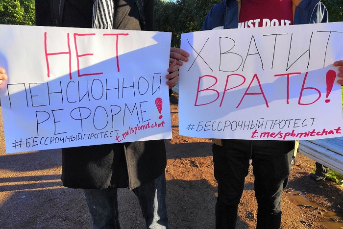 В Петербурге на Марсовом поле устроили бессрочную акцию протеста против повышения пенсионного возраста. Вечером 13 сентября нескольких участников задержали.