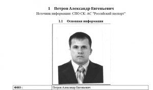 • В досье ФМС на Петрова, которое оказалось в распоряжении The Insider и Bellingcat, нет данных о получении других национальных и загранпаспортов и информации о местах регистрации, как в обычных досье службы. Свой паспорт в 2009 году подозреваемый в отравлении Скрипалей получил «взамен испорченного», в досье указан его номер, однако найти данные о документе в базе ФМС журналистам не удалось. The Insider отмечает, что в системе ФМС нет вообще никакой информации о Петрове до 2009 года.