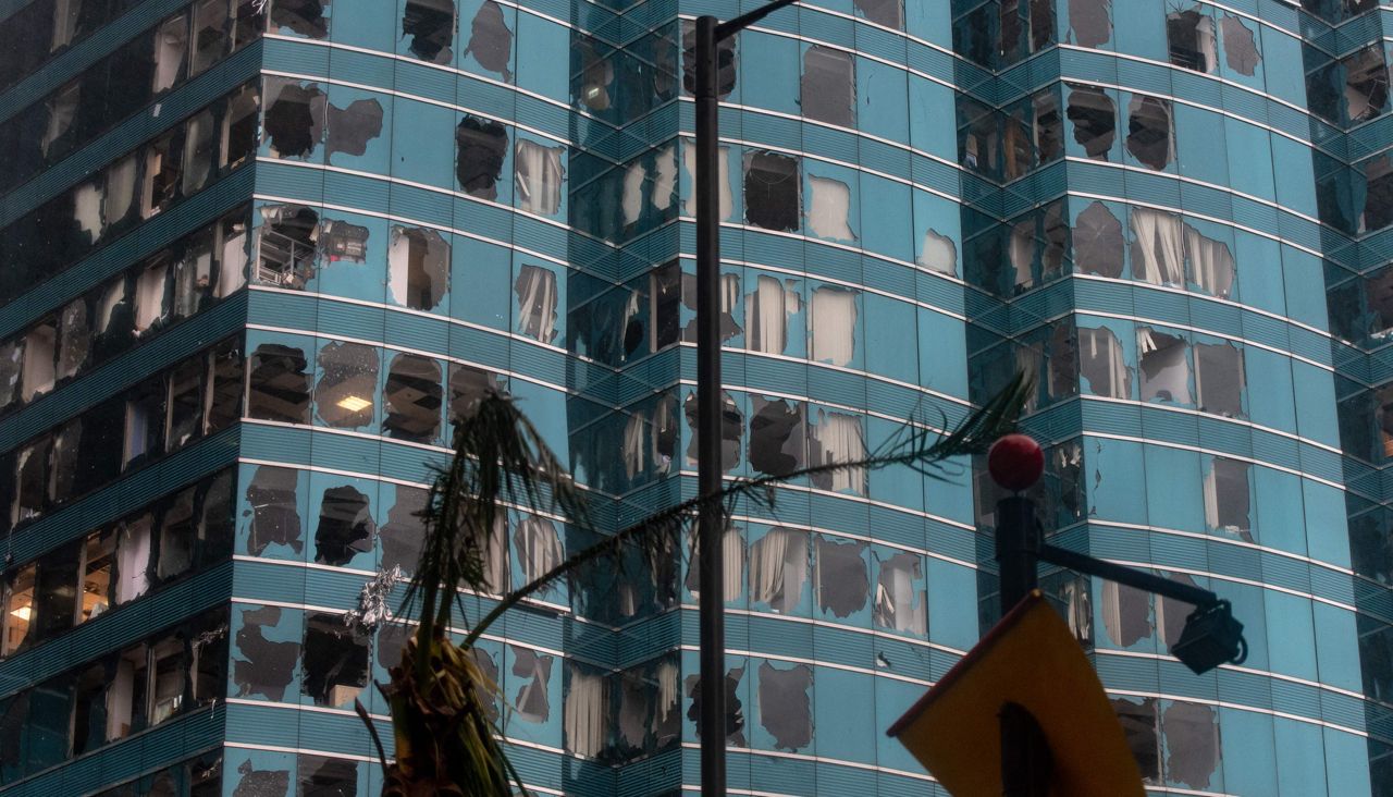 Philip Fong / AFP / Scanpix / LETA Здание в Гонконге, пострадавшее от тайфуна. 16 сентября 2018 года