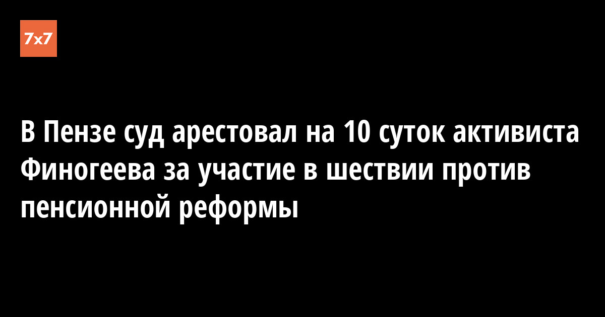 Ленинский районный суд Пензы 14 сентября назначил активисту движения «Поколение нового времени» Ивану Финогееву 10 суток ареста по части 8 статьи 20.2 Кодекса об административных правонарушениях («Повторное нарушение порядка организации и проведения митинга, шествия»), передает корреспондент «7x7». Причиной стало участие Финогеева в несогласованном шествии противников пенсионной реформы 9 сентября.