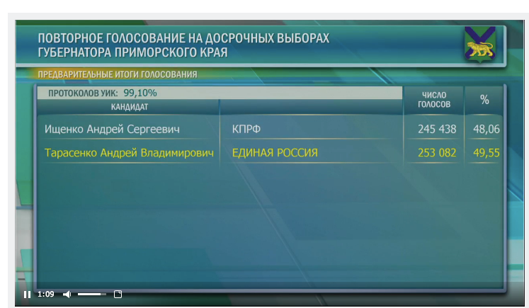 После этого разрыв стал резко сокращаться (вот феноменальный график!), причем после обработки 97,87% протоколов онлайн-табло в ЦИКе не обновлялось около часа. За этот промежуток — с 98,77% до 99,03% обработанных протоколов — количество голосов за Ищенко сократилось на 5, а за Тарасенко — увеличилось на 13,5 тысяч, и единоросс вырвался вперед. Когда было обработано 99,1% — он стал недосягаем.