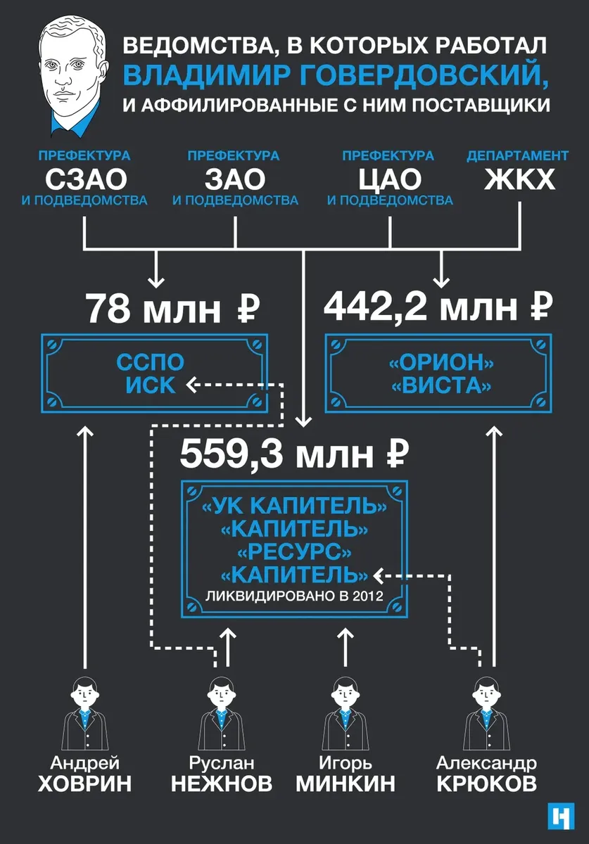 Подряды от ведомств, которые возглавлял Говердовский, получал и бывший начальник «Инженерной службы района Фили–Давыдково» Руслан Нежнов. Компании, связанные с Ховриным, Нежновым и их партнерами получили госконтрактов больше чем на 1 млрд рублей.