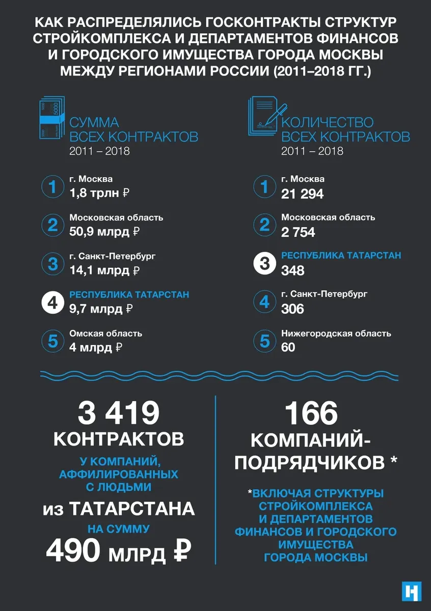 Мы решили посчитать, какую долю контрактов госучреждений, подведомственных землякам Хуснуллина (Стройкомплекс, департаменты финансов и городского имущества Москвы), получили компании из Татарстана с 2011 года. Получилось, что татарстанские организации-подрядчики лидируют по сумме полученных в Москве госконтрактов. Впереди них, что закономерно, — только московские, областные и петербургские подрядчики. А вот компании из Омской области, например, отстают от татарстанских больше, чем в два раза. По количеству же госконтрактов подрядчики из Татарстана опережают даже питерцев.